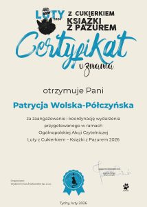 Z satysfakcją informujemy, że 🅢🅟➊ otrzymała certyfikat za udział w projekcie czytelniczym „Cukierku, Ty łobuzie!”