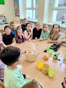 Dzieci z wielkim zaangażowaniem sadziły cebulki, siały owies wielkanocny, aromatyczne zioła: oregano, bazylię i koperek oraz rośliny: lawendę i rukolę. Dowiedzieliśmy się, czego rośliny potrzebują do wzrostu – ziemi, wody i słońca!