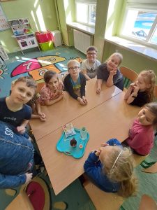W świetlicy dla klas pierwszych sprawdzaliśmy reakcję chemiczną kwasu z zasadą. Brzmi poważnie, ale to eksperyment, do którego użyliśmy kubka, octu, sody oczyszczonej i barwnika spożywczego, żeby na naszych oczach doszło do widowiskowej reakcji. Z połączenia tych dwóch składników powstała piana, która się pieni (porusza), a swoim wyglądem przypomina lawę wpływającą z wulkanu.